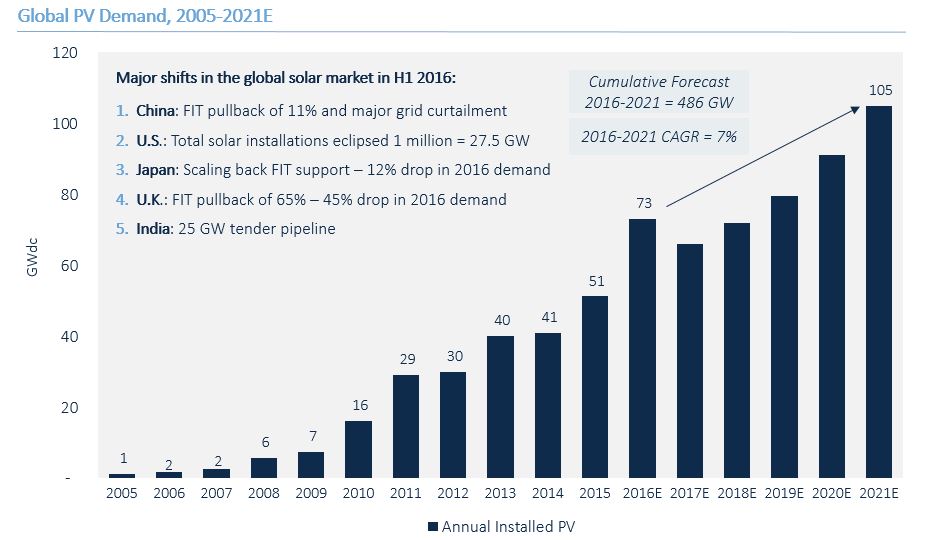 按照GTM最新公布的太陽能需求監測陳述來看,2016年,環球新增太陽能裝機容量將比客歲增加43%,到達73吉瓦。