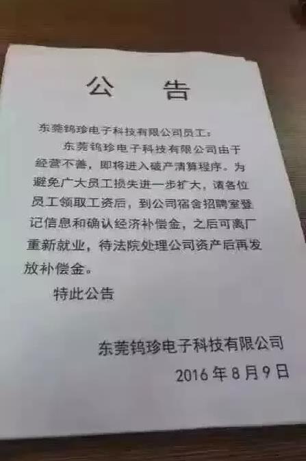 東莞鎢珍電子科技無限公司因為運營不善,行將進入停業(yè)清理法式。為防止泛博員工喪失進一步擴展,請列位員工支付人為后,到公司宿舍雇用室掛號信息和確認經(jīng)濟抵償金,以后可離廠從頭失業(yè),待法院處置公司資產(chǎn)后再發(fā)放抵償金。