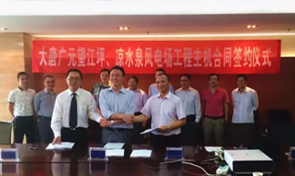 西方風電副總司理詹明與大唐廣元風電開辟無限公司總司理羅陳代表各自公司簽訂條約,大唐四川發電無限公司總司理助理王連華等見證此次簽約。